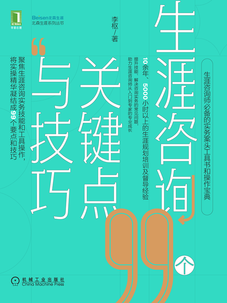 本书是一本能够帮助生涯咨询师更好地提升技能、解决咨询实务常见问题的实务操作宝典。本书聚焦实务技能和工具操作,将实践技巧凝练成99个要点,助力生涯咨询师从入门到专家的专业成长,是生涯咨询师人手一册的经典书。本书尝试着将咨询的实践和督导中积累的经验进行梳理,对职业辅导(vocational guidance)和生涯咨询(career counseling)的理论、方法、工具进行整合。本书的内容来自作者多年的学习、咨询、督导和教学的实践经验,以及和北森生涯研究院同事们在实务切磋中总结的方法。同时本书广泛收集和整合了生涯领域国际国内的经典著作和前沿观点的诸多精华,并尝试对生涯咨询与辅导(以下简称为“生涯咨询”)本土化做探讨。为了增强实务参考价值,本书呈现了操作步骤详解、案例、话术等内容,将有代表性的常见困惑、咨询经验凝结成99个要点,从以下三个方面,帮助生涯咨询师提升生涯咨询知识和技能:(1)生涯理论在实务中的应用。本部分对生涯理论在实务中应用的经验进行提炼,对部分经典理论和本土化观点的应用进行探讨。(2)生涯咨询与辅导过程中的操作要点。生涯咨询工作从前期接待到结案有诸多关键操作要点,这些细节和技术对咨询顺利推动至关重要。(3)个案推动环节的工具箱。本部分聚焦个案推动环节如何恰当地选择咨询工具,对工具的操作要点、话术及注意事项进行实务经验分享。