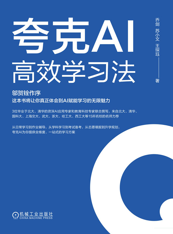 这本书的3位作者在AI应用和教育科技领域有丰富的经验,无论你是否有AI工具使用经验,本书都将带领你零基础掌握夸克AI的各项功能及使用方法,尤其是它在学习和教育领域的应用。书中针对各种学习场景给出了大量提示词、案例和详细的操作步骤,确保你一看就懂、一学就会。本书得到了来自人大附中、北师大附属实验中学等知名中学教师,以及北京大学、清华大学、中国科学院大学、上海交通大学、浙江大学、南京大学、哈尔滨工业大学、武汉大学、天津大学、厦门大学、华中科技大学、西北工业大学、中央民族大学等知名大学的教授、研究员等的高度评价和联袂推荐。